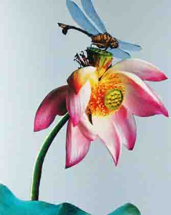 楹联:双胞菡萏开怀笑;一客蜻蜓恋彩来。